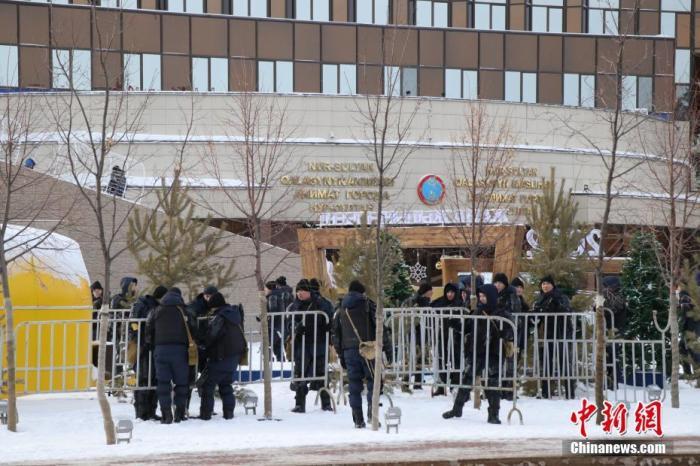 当地时间1月6日,在哈萨克斯坦首都努尔苏丹市政府门前,警卫人员用围栏将建筑围挡起来。中新社记者 张硕 摄