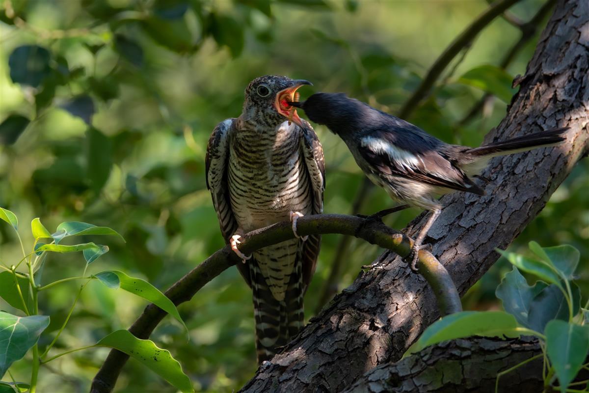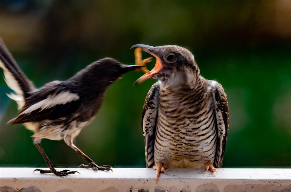 更有趣的是,这只鹊鸲后来还孵出了一只杜鹃,也带到杨河家来“串门”。不知道是不是因为这个插曲,这只鹊鸲经常遭到老公家暴,被啄得满地羽毛。