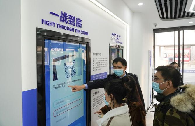 民警介绍服务站里的反诈宣传互动体验项目。 新华社记者陈钟昊 摄