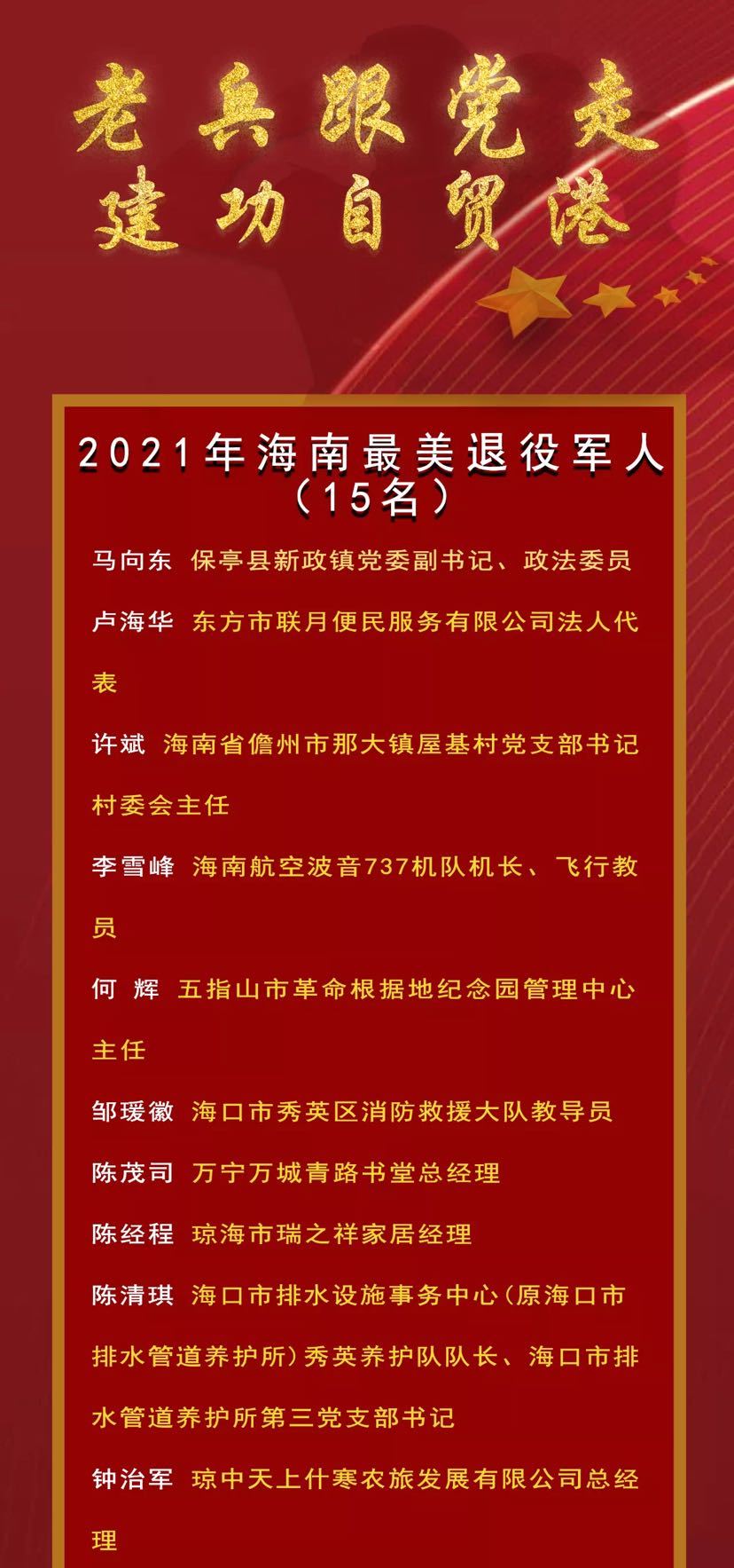 据悉,海南从2019年开始开展“最美退役军人”和“最美拥军人物”的评选,2021年是第三次在全省范围内开展先进典型人物选树活动,旨在发挥好先进典型的激励作用,充分调动广大退役军人、拥军人物积极投身海南自贸港建设。
