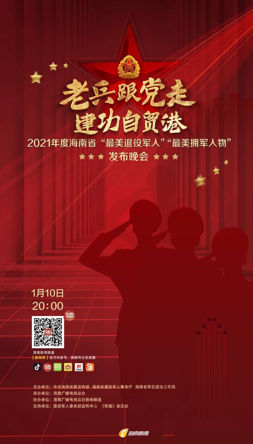 1月10日晚上8点,《老兵跟党走 建功自贸港——2021年度海南省“最美退役军人”“最美拥军人物”发布晚会》将在海南广播电视总台1000平方米演播厅进行网络直播,发布晚会现场将以先进典型为原型,创作人物故事讲述稿,同时通过歌舞、朗诵、音诗画、情景访谈等方式,讲述最美退役军人故事,展示新时代退役军人良好的精神风采。