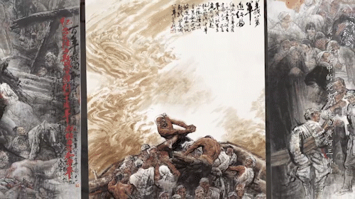 这幅画作共分为三个部分。第一部分《百年家国耻》,画家逼真地刻画了被日本侵略者残害的中国平民、南京大屠杀的凄惨场景。