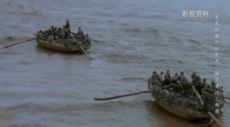 画面上方是气势磅礴、汹涌奔流的黄河,下方是满载着八路军战士的木船,雕塑般的战士们引吭高歌,情绪激昂。