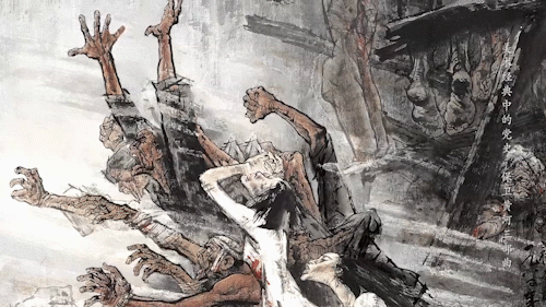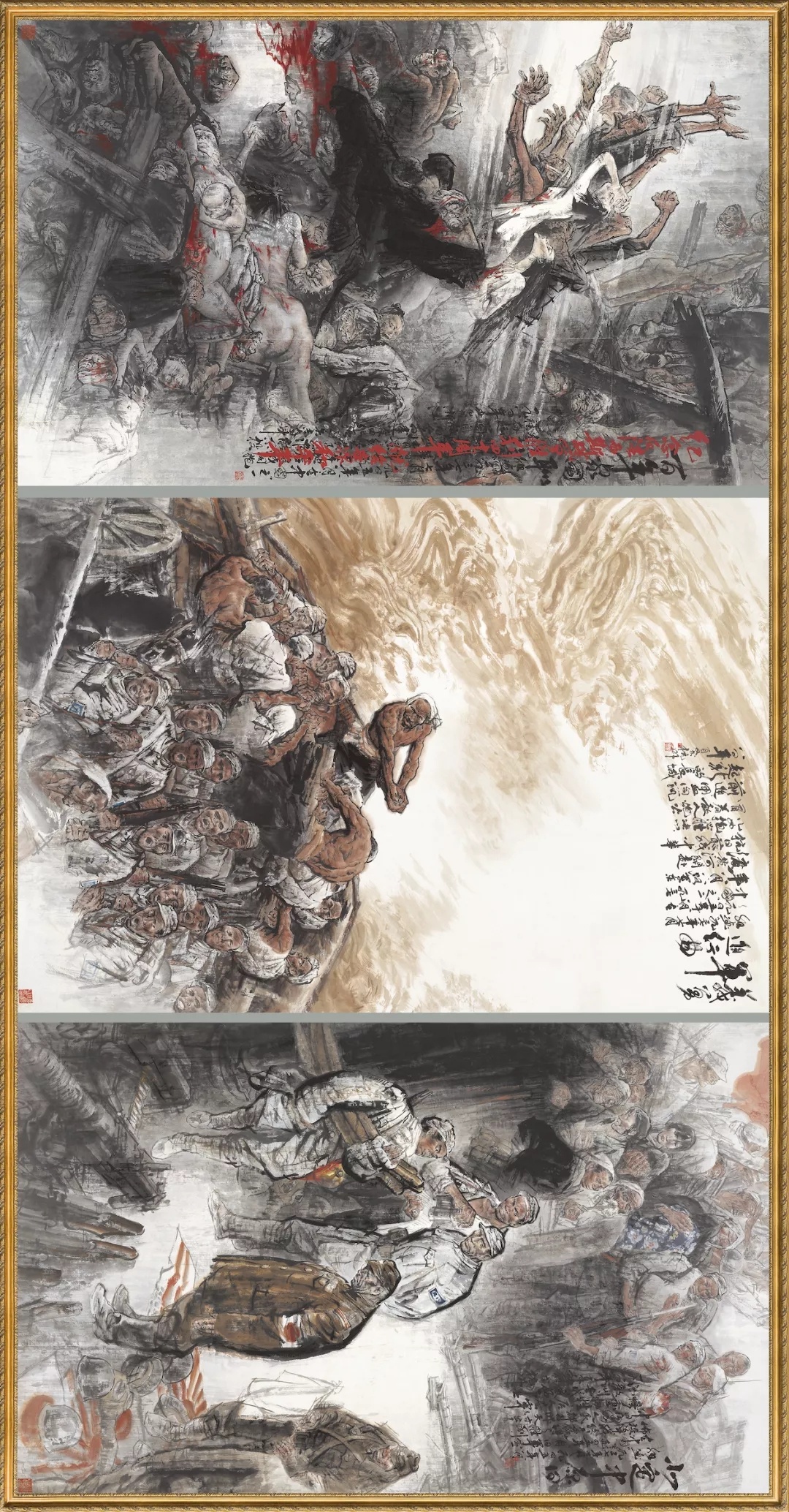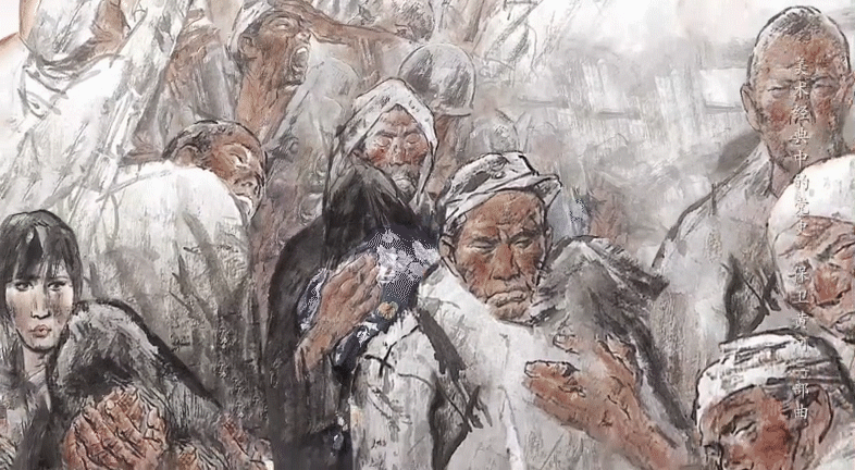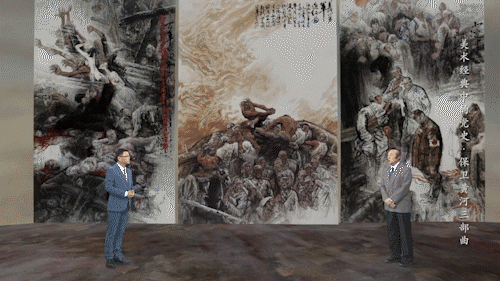 这幅画作共分为三个部分。第一部分《百年家国耻》,画家逼真地刻画了被日本侵略者残害的中国平民、南京大屠杀的凄惨场景。