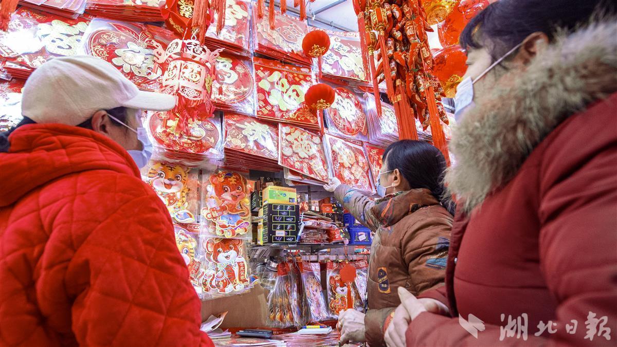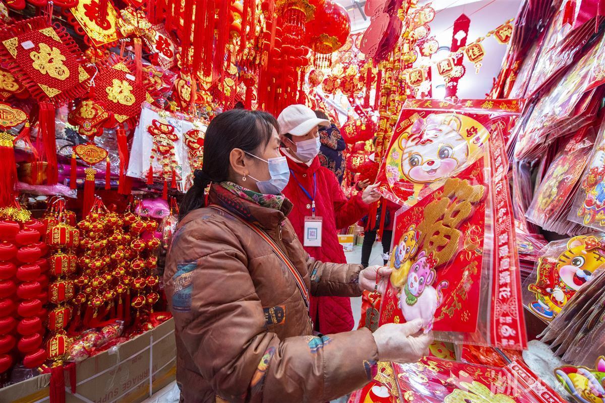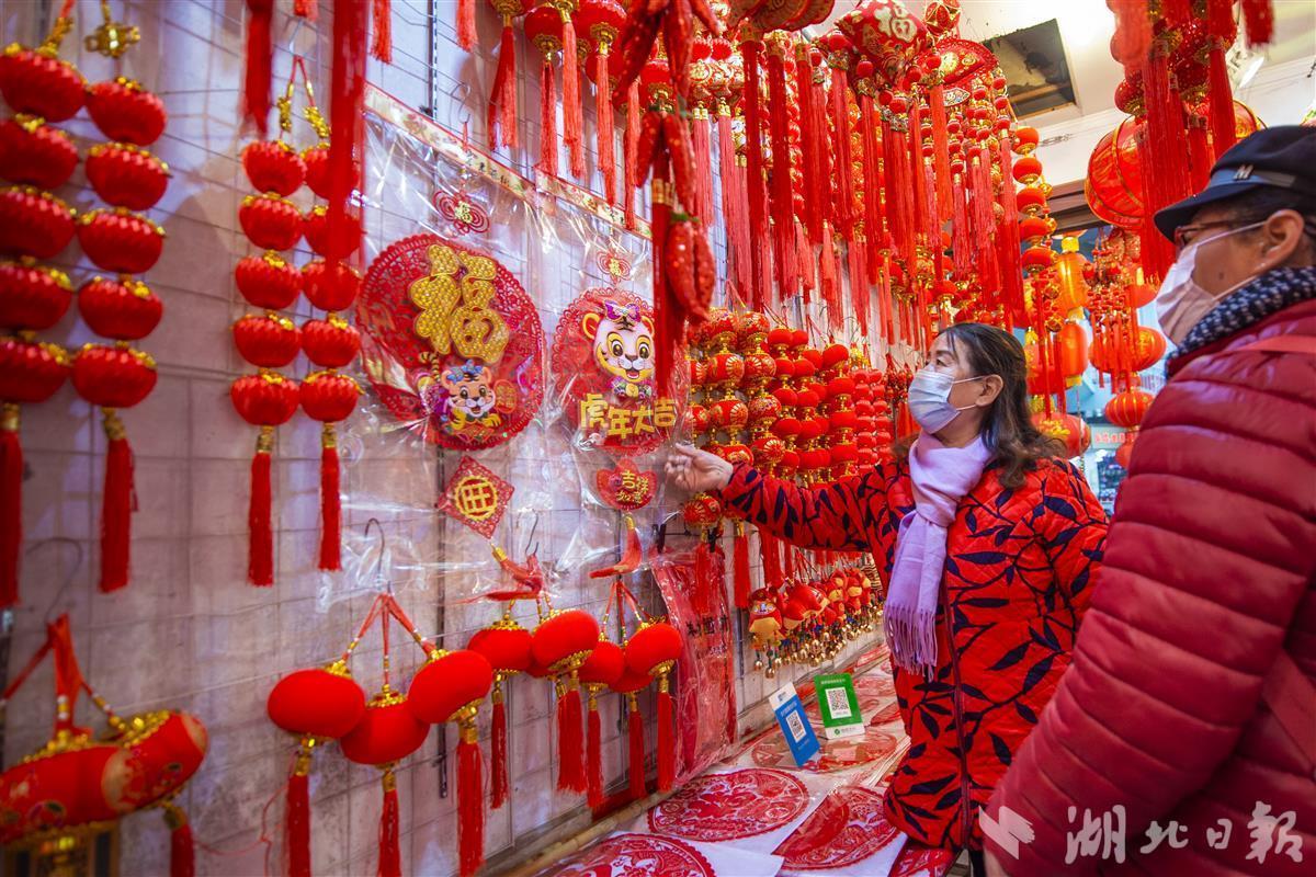 1月10日,农历腊八节,武汉市硚口区汉正街商铺中挂满各式各样的虎年特色春联、福字、灯笼等年货用品供市民选购。俗话说“过了腊八就是年”,当天前往汉正街“打年货”的市民络绎不绝,浓浓的年味出现在街头巷尾。(湖北日报全媒记者 何宇欣 摄)