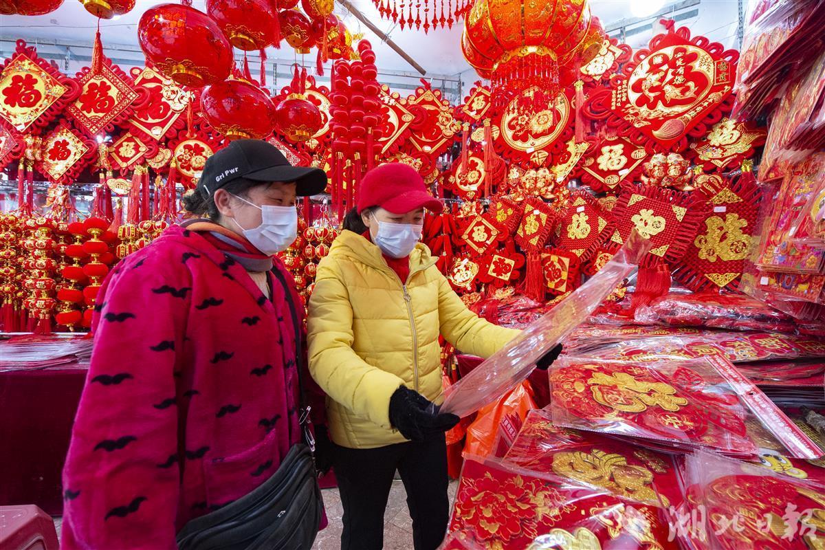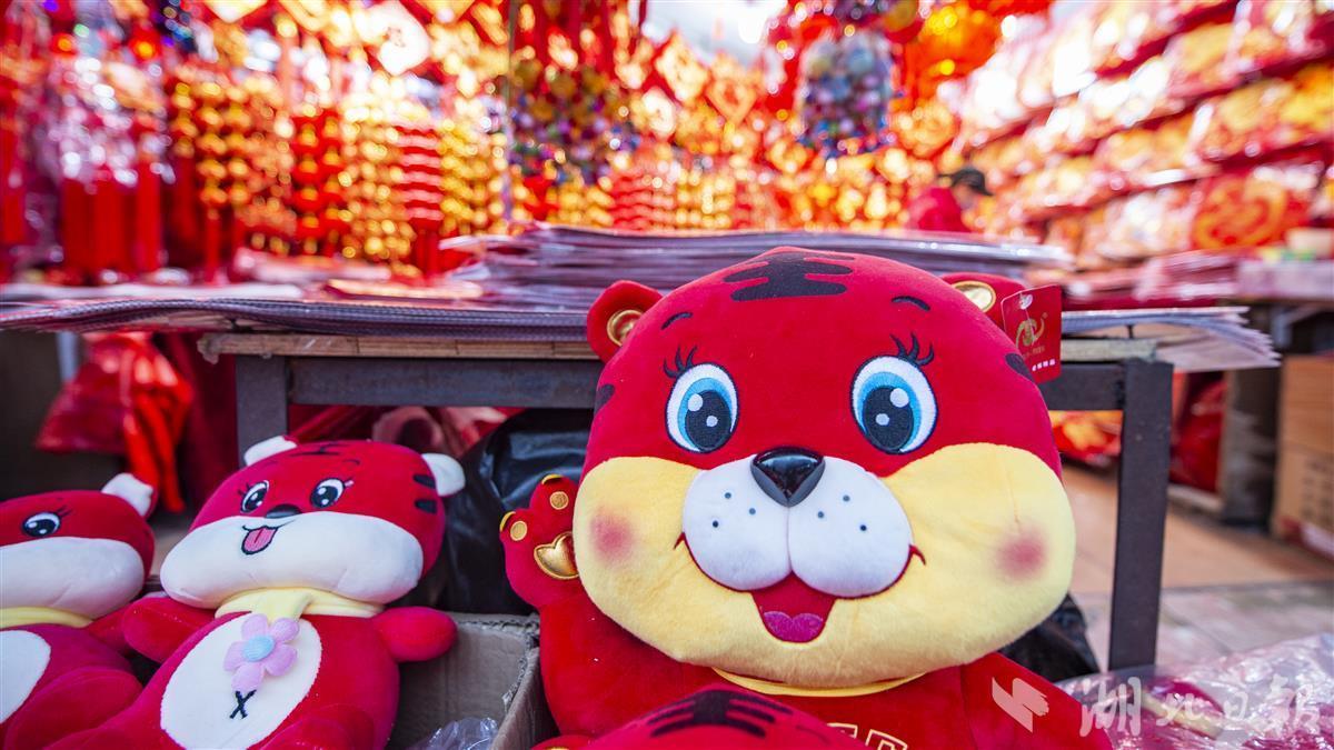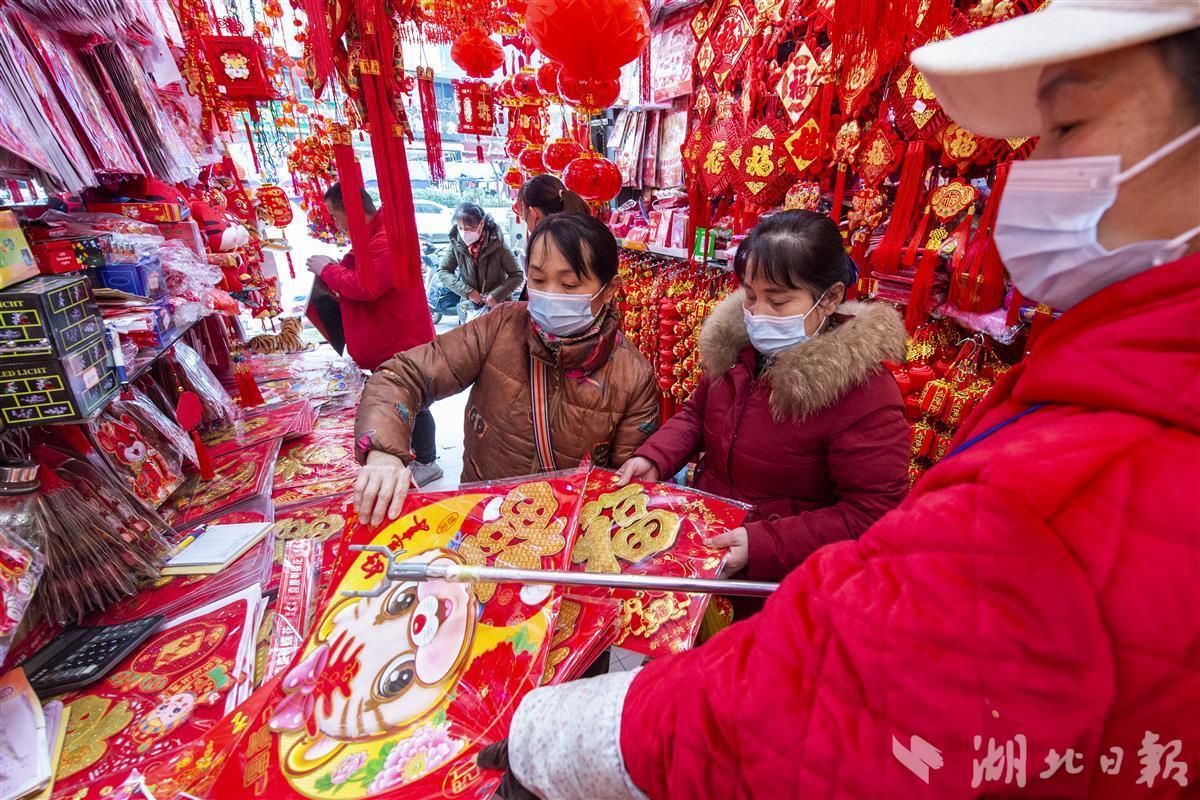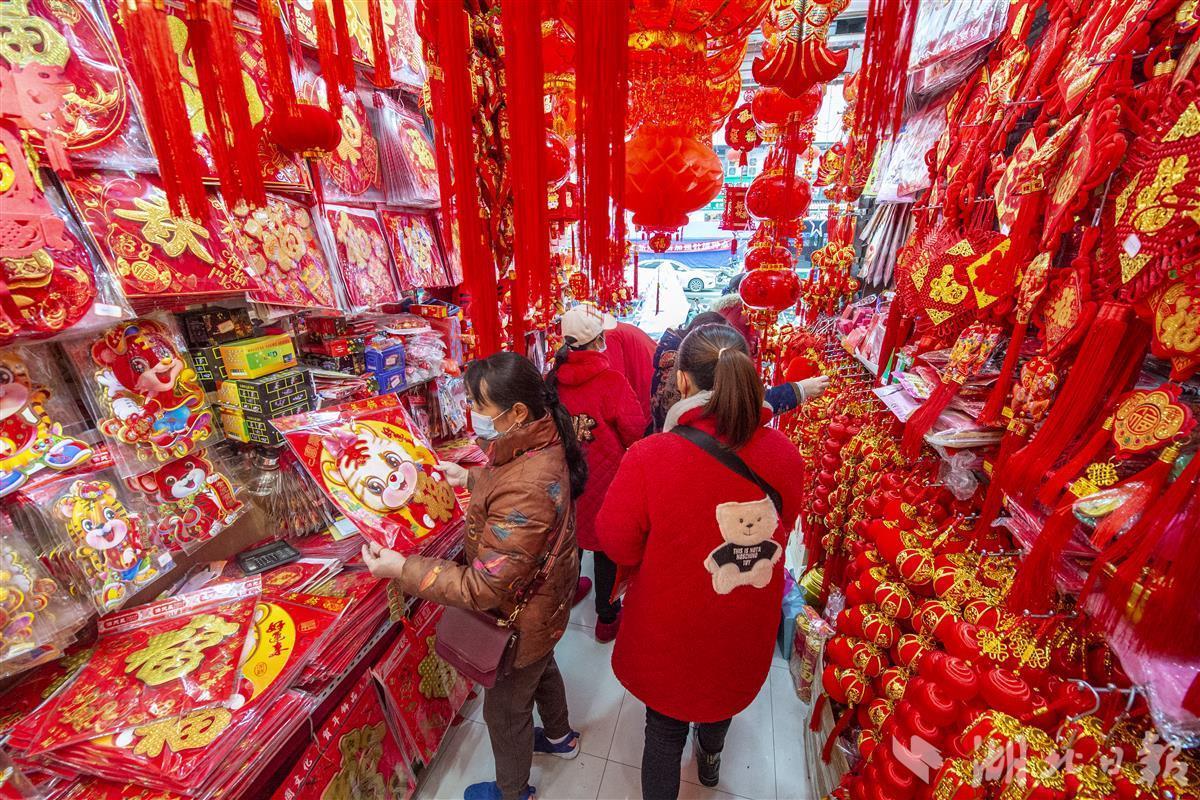 1月10日,农历腊八节,武汉市硚口区汉正街商铺中挂满各式各样的虎年特色春联、福字、灯笼等年货用品供市民选购。俗话说“过了腊八就是年”,当天前往汉正街“打年货”的市民络绎不绝,浓浓的年味出现在街头巷尾。(湖北日报全媒记者 何宇欣 摄)