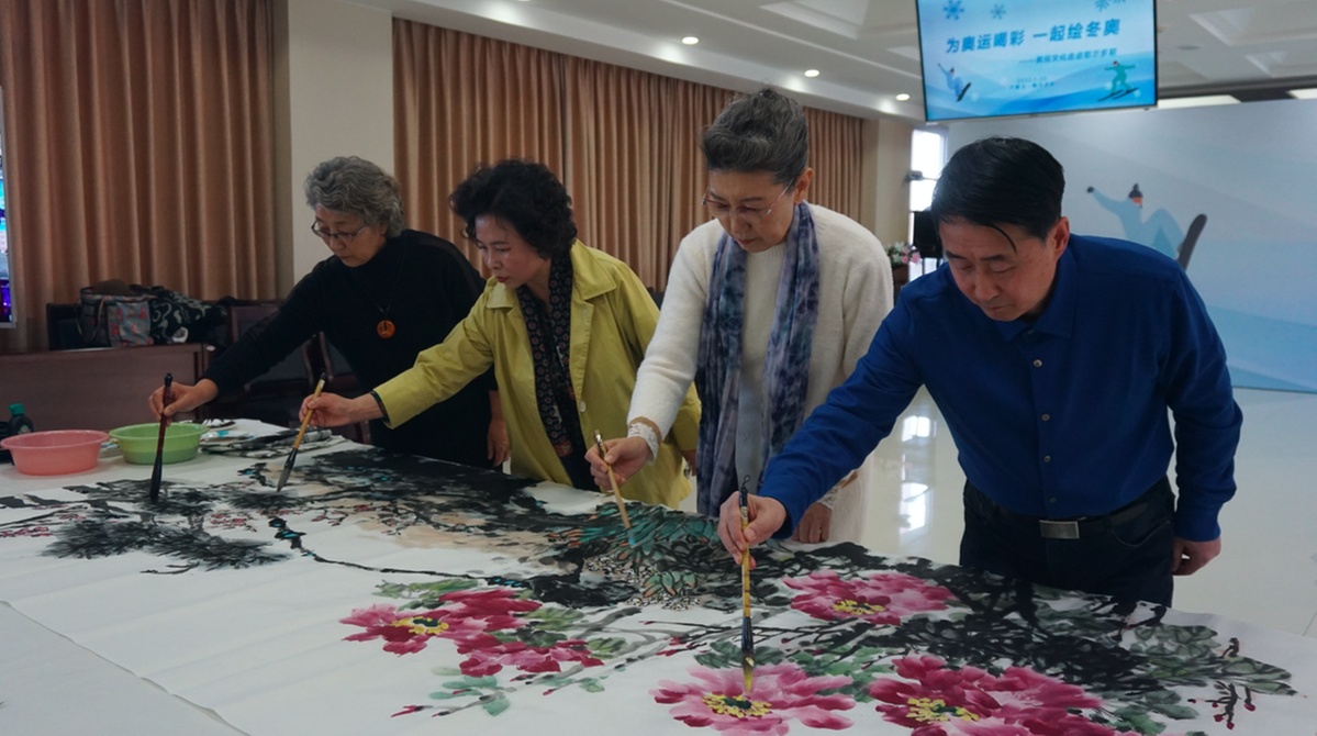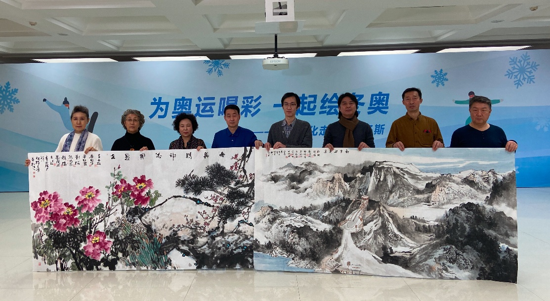 在笔会创作中,艺术家们分组进行创作,分别创作了一幅名为《初雪迎冬奥》的山水画,和一幅名为《奥运精神花开盛世》的花鸟画。中国工笔画学会人物画艺委会委员、理事,中国女画家协会常务理事要红宇介绍到:中国的传统文化是实际上就包含了一种顽强的精神,传统的绘画题材中松竹梅也是表现了不畏艰险、不屈不挠的精神,中国人的这种气节是与奥运精神是非常契合的,所以我们这次创作的花鸟画作品也是希望表现冬奥运动健儿的优秀品质,为他们加油。