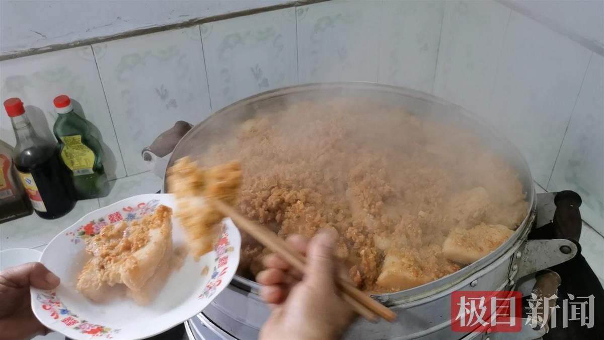 在杀猪匠分解猪肉时,家中的厨房已燃起炊烟。好客的女主人将精选的五花肉和排骨拌上了“榨广椒”,一层层码进蒸笼里。另外一口锅中,满含花椒、辣椒的火锅底汤正在翻滚。