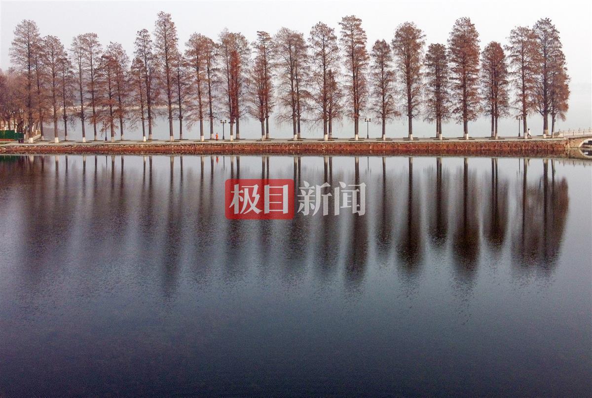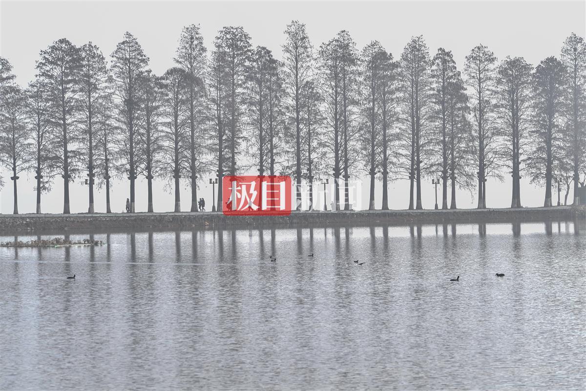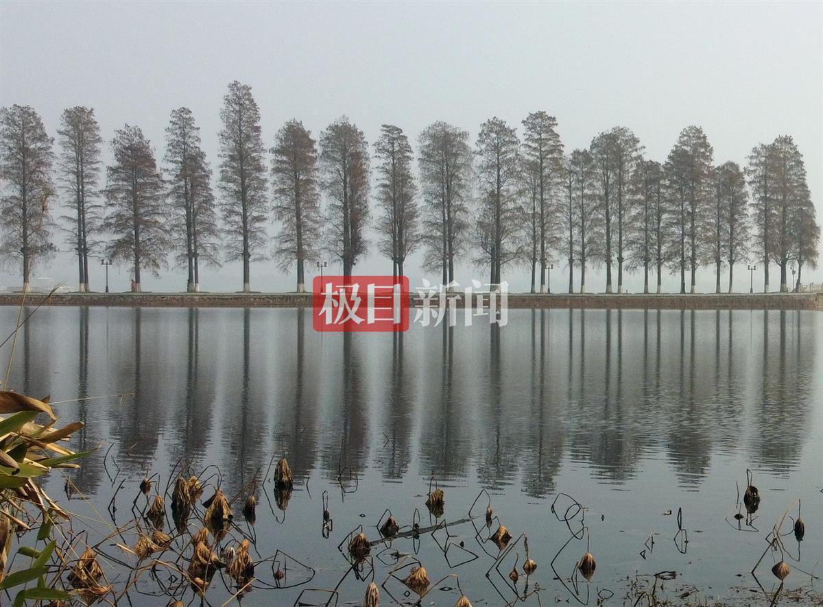 中午,阳光已温暖着江城,但在长江二桥上,两边的江面仍是雾蒙蒙;城区的建筑物都被笼罩在弥漫的雾气之中;东湖绿道水杉林和它们在水中的影子,如清雅的水墨画。