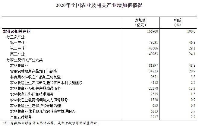 为全面准确反映农业生产、加工、物流、营销、服务等全产业链实现的价值,国家统计局根据《农业及相关产业统计分类(2020)》,依据相关统计核算资料,核算了全国农业及相关产业增加值。