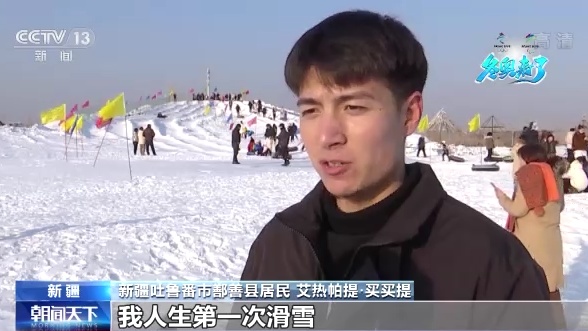 新疆吐鲁番市鄯善县居民 艾热帕提·买买提:今天是我人生第一次滑雪,玩得特别特别开心。