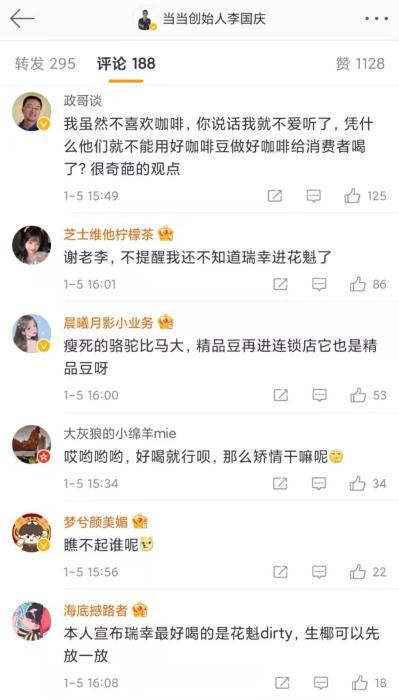 在李国庆微博评论区,不少网友则表示:“瘦死的骆驼比马大,精品豆做连锁咖啡也是精品豆”、“好喝就行,那么矫情干嘛呢”“感谢老李提醒,不说都不知道瑞幸有花魁了”……
