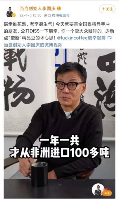 1月5日,当当网创始人李国庆在抖音、小红书、微博上发布了同一条视频,标题分别为:《听老李一句话,精品咖啡不适合你做》《瑞幸咖啡你到底要干个啥?》《瑞幸推花魁,老李很生气!今天就要替全国喝精品手冲的朋友,公开diss一下瑞幸,你一个卖大众咖啡的,少动点“垄断”精品豆的坏心思!》。