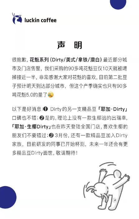 1月11日,瑞幸再发声明,称花魁5.0系列产品在多个城市已经售罄,90多吨“花魁”仅10天就被喝掉将近一半。第二批豆子预计12日到达部分城市,但这个产季只有90多吨花魁5.0的量了。