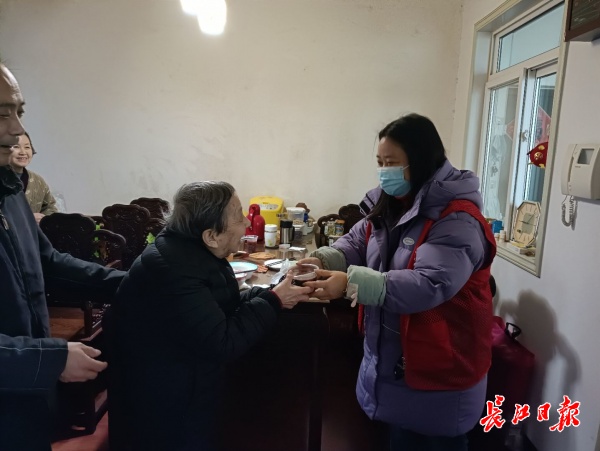 社区工作人员为陈雪丽老人送上腊八粥。通讯员刘娟娟 摄