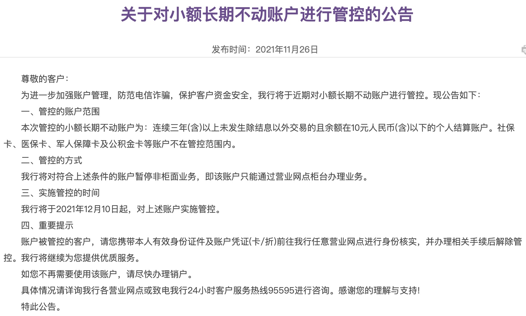 更早之前,光大银行于2021年12月10日开启了对小额长期不动账户进行管控的公告,称将对连续三年(含)以上未发生除结息以外交易的且余额在10元人民币(含)以下的个人结算账户(社保卡、医保卡、军人保障卡及公积金卡等账户不在管控范围内)暂停非柜面业务,即该账户只能通过营业网点柜台办理业务。