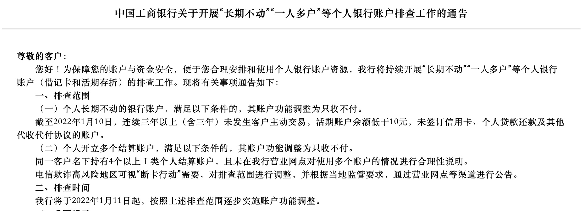 根据工商银行公告,此次排查工作于2022年1月11日起开始。排查范围包括两大类,一类是个人长期不动的银行账户,即截至2022年1月10日,连续三年以上(含三年)未发生客户主动交易,活期账户余额低于10元,未签订信用卡、个人贷款还款及其他代收代付协议的账户,该账户功能调整为只收不付。