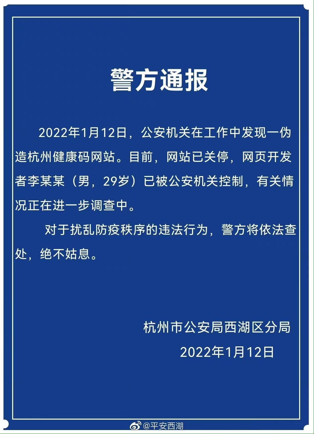 杭州市公安局西湖区分局通报:1月12日,公安机关在工作中发现一伪造杭州健康码网站。目前,网站已关停,网页开发者李某某(男,29岁)已被公安机关控制,有关情况正在进一步调查中。