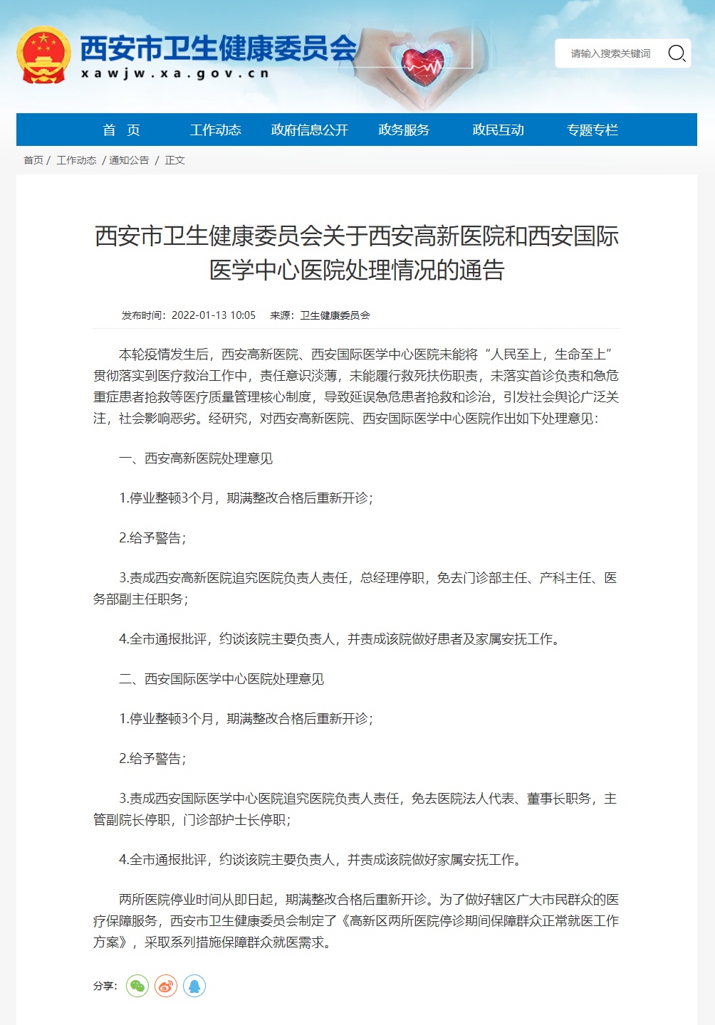 本轮疫情发生后,西安高新医院、西安国际医学中心医院未能将“人民至上,生命至上”贯彻落实到医疗救治工作中,责任意识淡薄,未能履行救死扶伤职责,未落实首诊负责和急危重症患者抢救等医疗质量管理核心制度,导致延误急危患者抢救和诊治,引发社会舆论广泛关注,社会影响恶劣。经研究,对西安高新医院、西安国际医学中心医院作出如下处理意见: