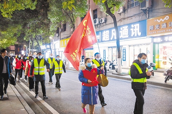 “我报名!”“我参加!”应答异常踊跃。一般晚6:30,下沉党员和志愿者准时在社区门前集结。7时整,队员们走上街头,敲着铜锣开展常态化治安防控、隐患排查、法治宣传和志愿服务等活动。