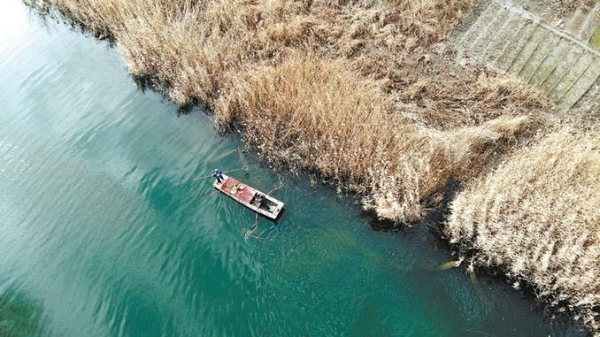 2021年12月16日,水上保洁员在白洋淀打捞水上杂物(无人机照片)。 新华社记者 骆学峰摄