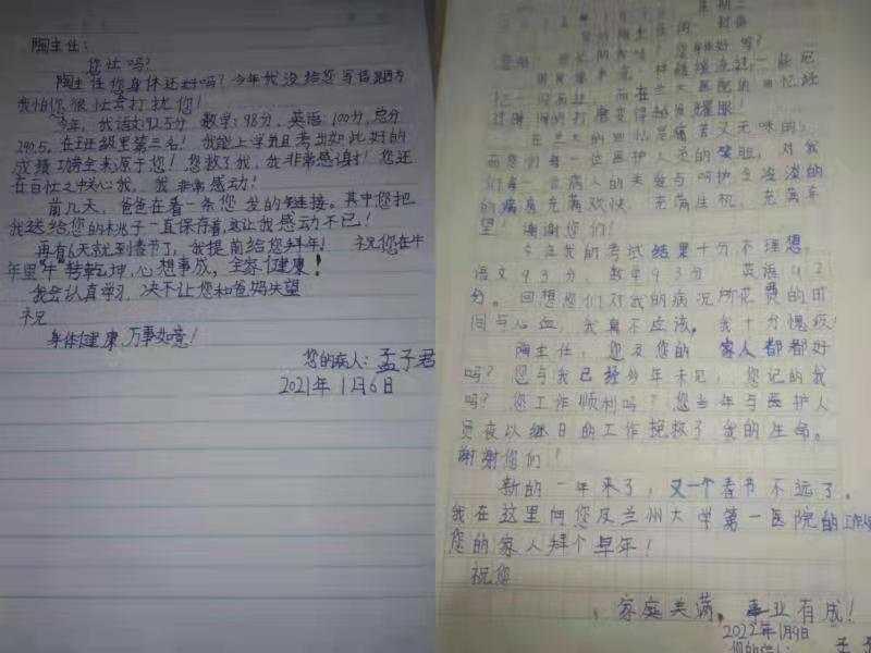 这年的信中,孟子君还向陶医生倾诉自己今年的考试成绩不理想,心里感到愧疚。不过,他对新年充满信心,写道:“新的一年来了,又一个春节不远了,我在这里向您及兰大一院的工作人员和您的家人拜个早年!”陶仲宾在回信中耐心举例鼓励他:一次的成绩说明不了什么,只要好好学习,下一次会取得更好的成绩,好的心态会带来好运。