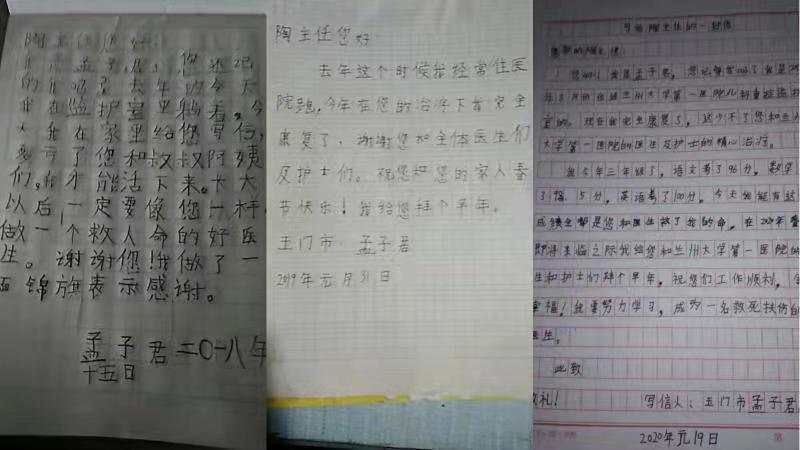“我是孟子君,您还记得我吗?去年的今天,我在监护室里躺着,今天我在家里给您写信,多亏了您和叔叔阿姨们,我才能活下来……”这是2018年的元旦,兰大一院儿科PICU副主任陶仲宾收到的一位来自甘肃玉门的7岁男孩的手写信。陶仲宾觉得十分暖心,他忙完工作后,微信编辑回信,发给孩子的父亲,鼓励孩子好好学习,早日康复。