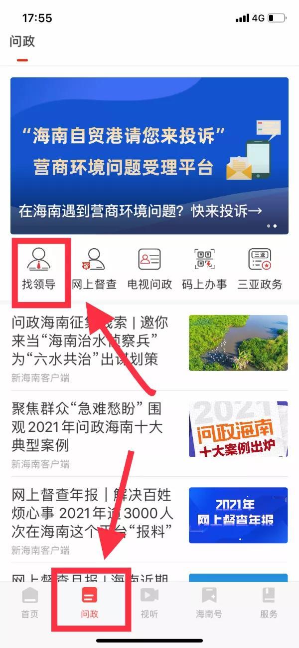 在新海南客户端点击左下角“问政”,点击左上角“找领导”,点击“我要留言给领导”,即可按提示留言。