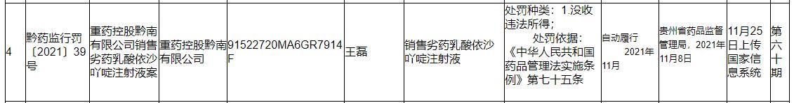 其中,行政处罚决定书(黔药监行罚〔2021〕39号)显示,重药控股黔南有限公司存在销售劣药乳酸依沙吖啶注射液的违法事实,依据《中华人民共和国药品管理法实施条例》第七十五条的规定,贵州省药品监督管理局决定没收其违法所得。作出处罚的日期为2021年11月8日。