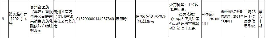 行政处罚决定书(黔药监行罚〔2021〕41号)显示,贵州省医药(集团)有限责任公司黔东南存在销售劣药乳酸依沙吖啶注射液的违法事实,依据《中华人民共和国药品管理法实施条例》第七十五条的规定,贵州省药品监督管理局决定没收其违法所得。作出处罚的日期为2021年11月8日。