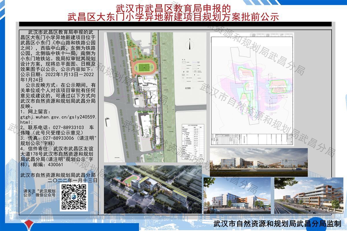 湖北日报讯(记者祝华)近日,武汉市自然资源和规划局发布规划批前公示,武昌区教育局申报的武昌区大东门小学异地新建项目位于小东门(中山路和铁路公园之间),西临中山路,东侧为铁路公园,北侧临中铁十一局,南侧为小东门地铁站。学校新建2栋5层教学楼(局部6层)和1栋6层综合楼,建筑面积19033.44平方米。武汉市自然资源和规划局拟审批其规划设计方案,现将总平面图、日照及效果图予以公示,有关单位或个人对该项目审批有任何意见或建议的,可在公示期间向武汉市自然资源和规划局武昌分局反映。