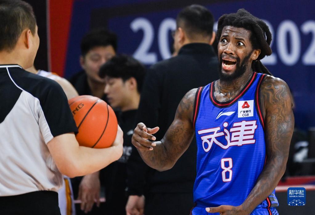 1月14日,天津先行者队球员伯顿(右)在比赛中与裁判交流。