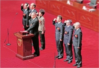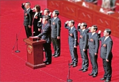 1月14日,新当选的武汉市第十五届人民代表大会常务委员会主任、副主任、秘书长进行宪法宣誓,胡立山(前排)领誓,后排从左至右为许甫林、朱库成、陈光菊、龙良文、胡树华、陈新垓。
