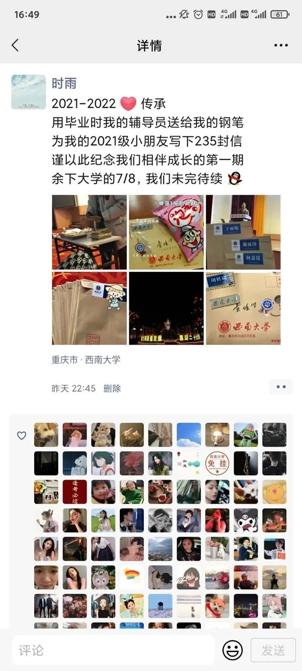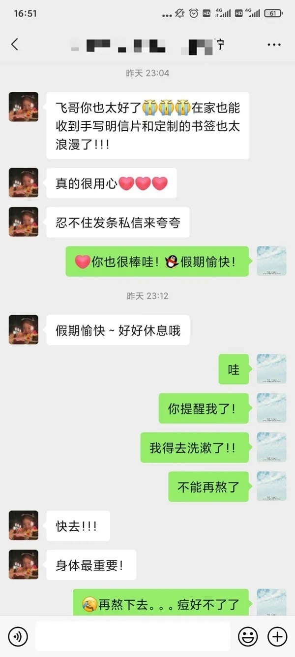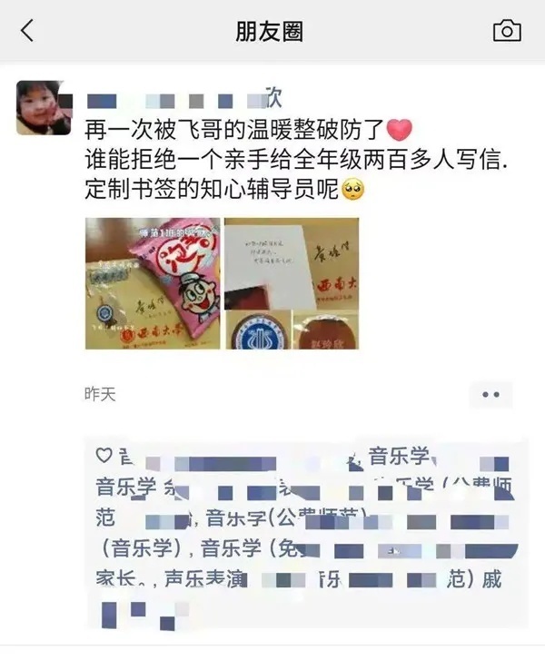 “不止是期末给我们每个人一封专属信,飞哥一直都很暖。“西南大学音乐学院2021级崔同学称,飞哥很有心,入学报到第一天,飞哥来寝室,居然喊出了他的名字。