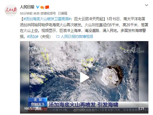 1月15日,南太平洋岛国汤加洪阿哈阿帕伊岛海底火山再次喷发。火山灰柱直径约5千米、高20千米,笼罩在火山上空。视频显示,巨浪冲上海岸,淹没道路,涌入民宅。多国发布海啸警报。