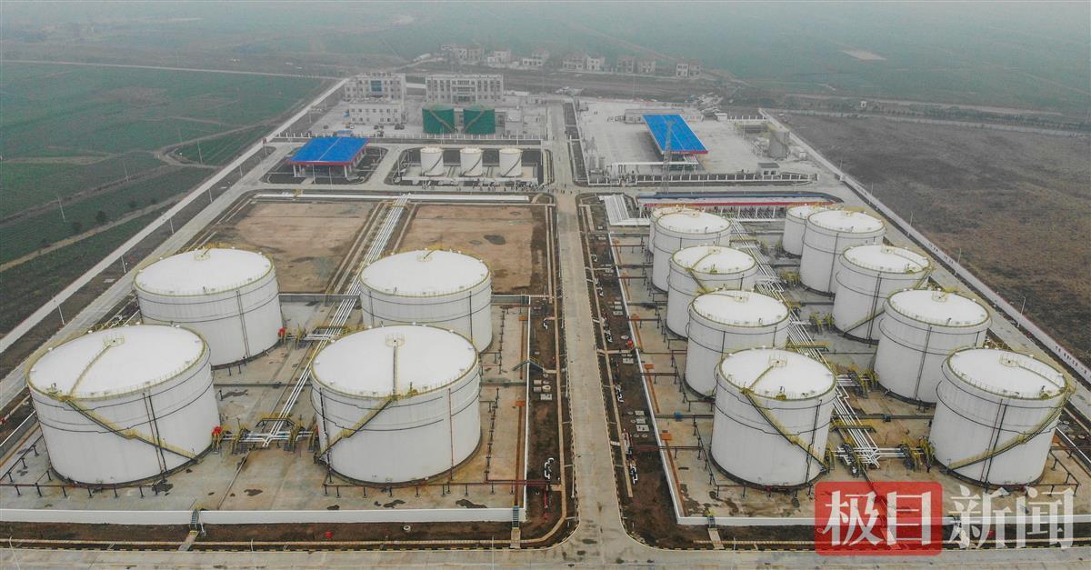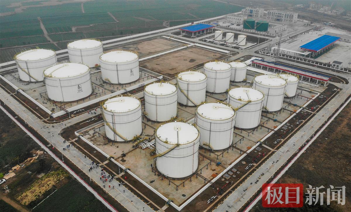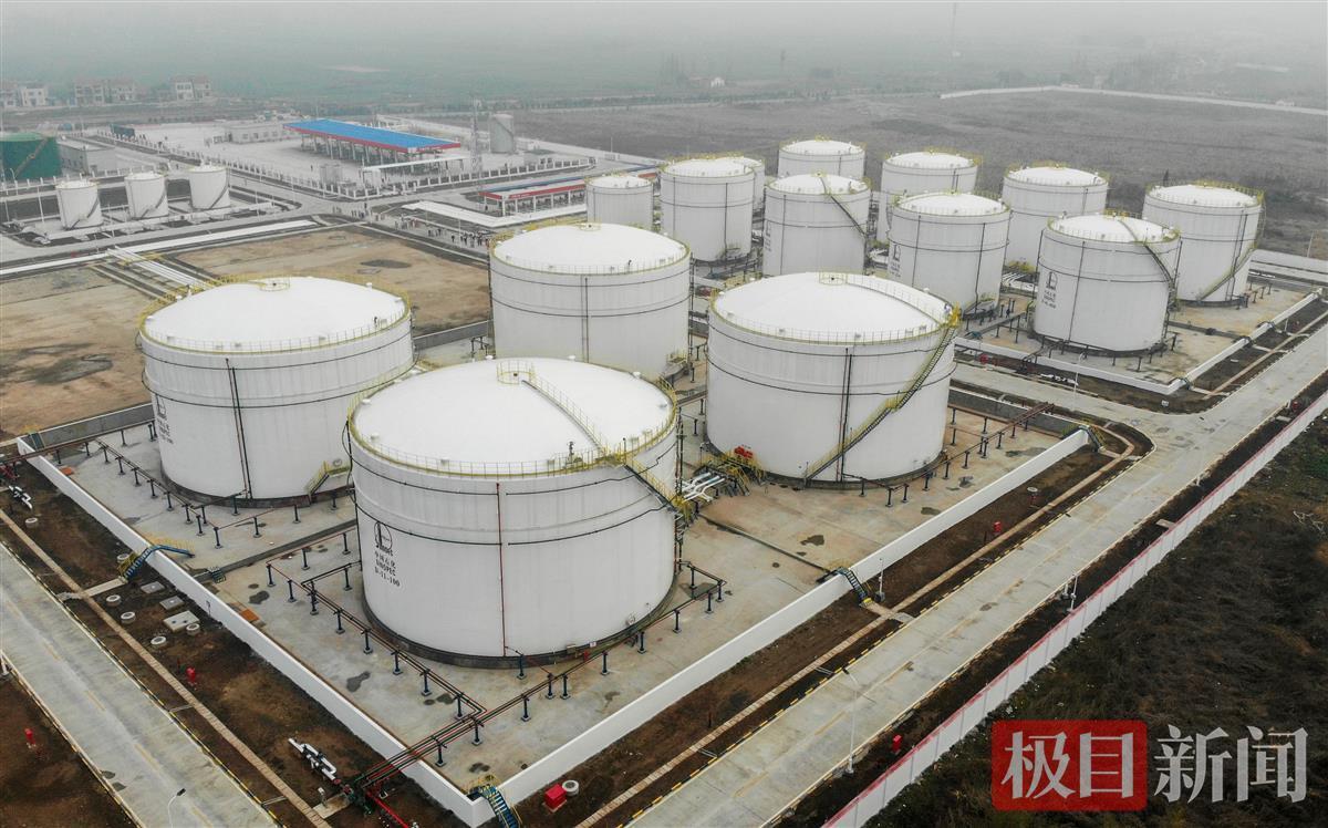 在新投运的荆州油库现场,极目新闻记者看到,洁白高大的储油罐依次整齐排列在库区一侧,油罐之间,各种密密麻麻的管道相互连接,然后通过主网管道连接百公里之外的荆门投油起点,实现了石油源源不断地供给。