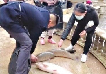 记者在物业工作人员提供的视频中看到,两名工作人员站在景观湖中捞鱼。几条草鱼被捞起来后,在渔网中翻滚扭动。工作人员将三条刚捞起来的草鱼甩到地面上,一名女业主指着地上一条跳得最欢的草鱼大喊“就这条”。一名老人蹲在地上,一手拿着黑袋子,一手试图将一条刚挣脱出来在地上翻滚的草鱼推回袋中。