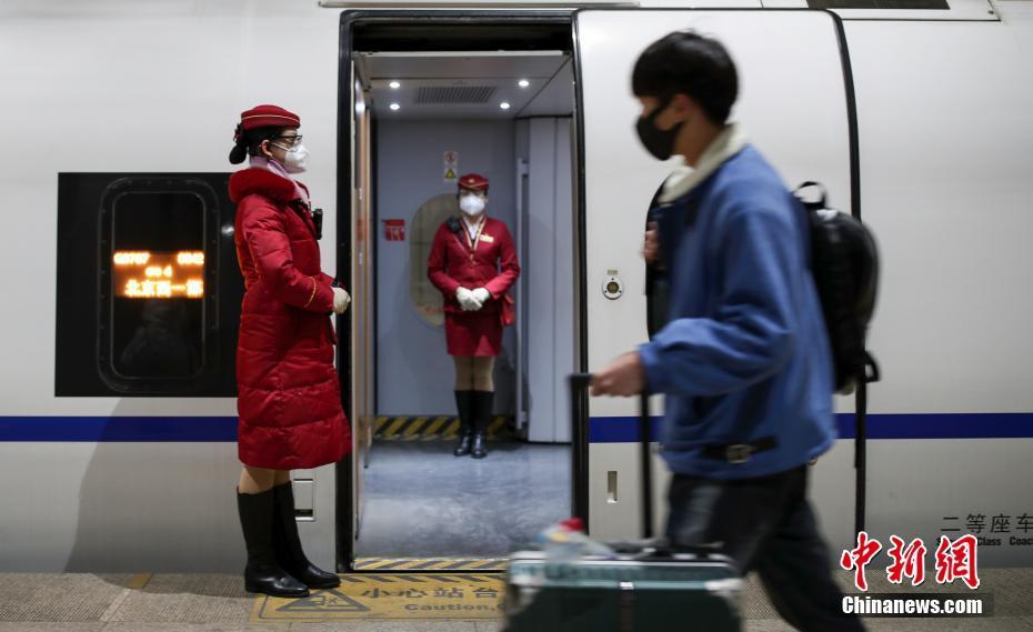 1月17日凌晨,北京地区第一趟始发列车——G6737次列车停靠在北京西站,乘务员迎候旅客乘车。当日,2022年春运大幕正式开启。今年春运从1月17日至2月25日,共40天。 中新社记者 贾天勇 摄