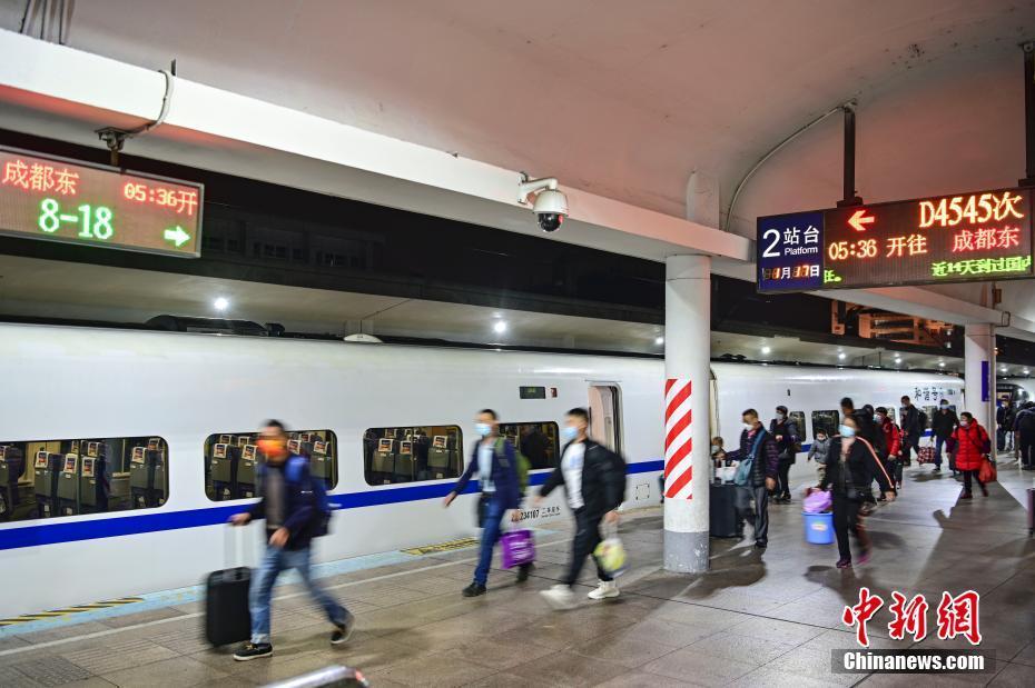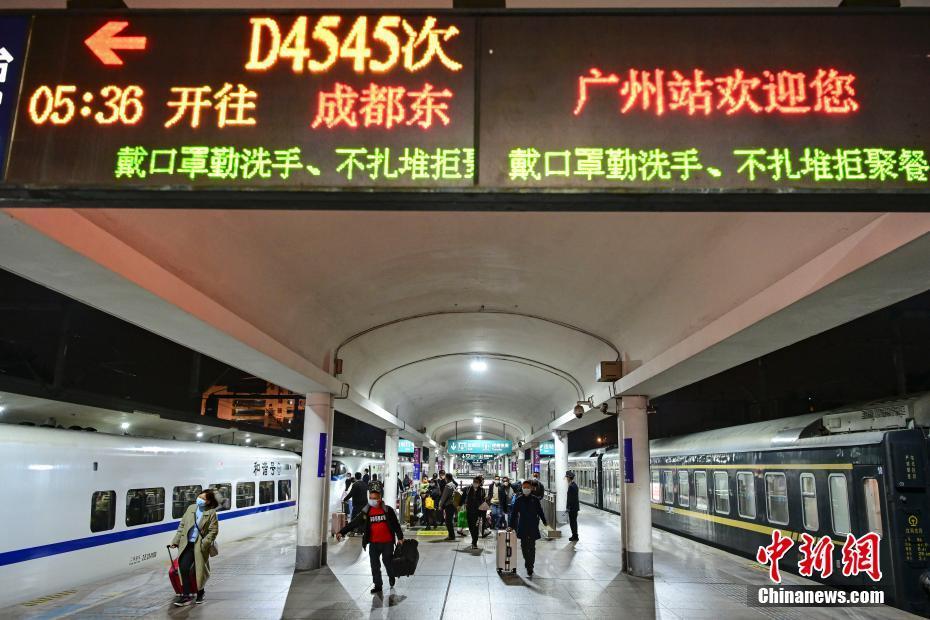 1月17日,广东省广州市,乘坐D4545次列车的旅客在广州站进站乘车。1月17日5点36分,广东春运首日首趟列车D4545次(广州—成都东)从广州站驶出,将于当日14点22分抵达成都东。 中新社记者 陈骥旻 摄