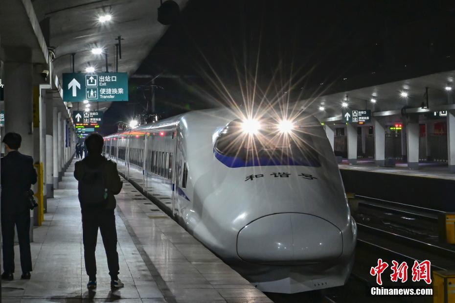 1月17日,广东省广州市,D4545次列车停靠在广州站内。1月17日5点36分,广东春运首日首趟列车D4545次(广州—成都东)从广州站驶出,将于当日14点22分抵达成都东。 中新社记者 陈骥旻 摄