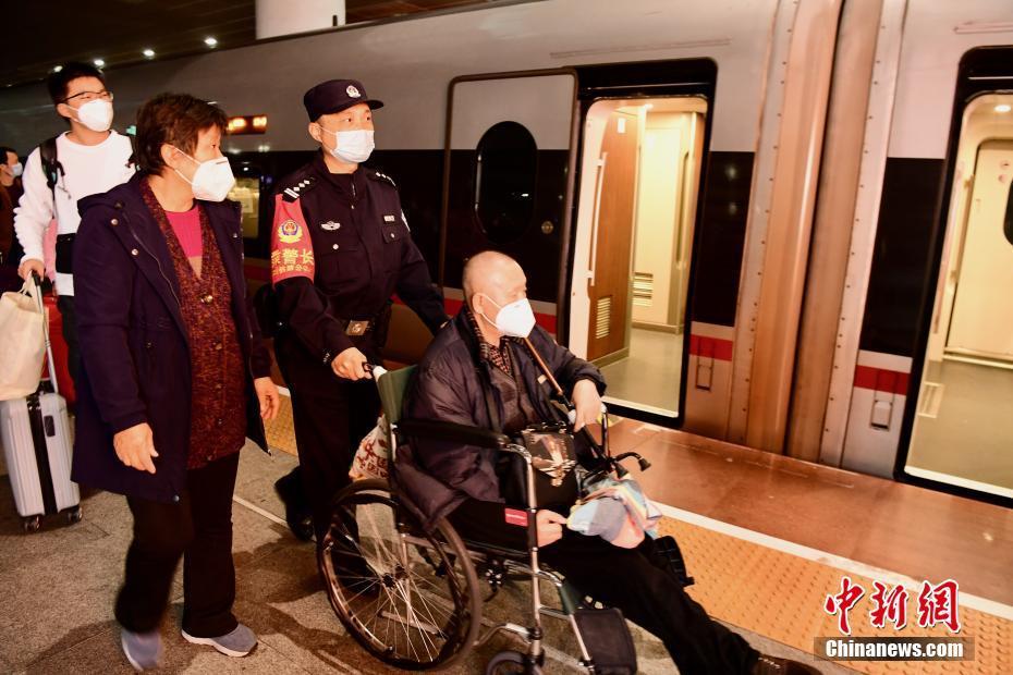 1月17日,2022年春运大幕开启,在深圳北站开往合肥南站的G636次高铁列车上,深圳铁路公安处乘警支队乘警与列车长格外繁忙,帮助困难旅客乘车,时刻提醒乘客做好安全防疫,一路守护旅客的安全。图为乘警帮助行动不便的旅客乘车。 中新社记者 陈文 摄