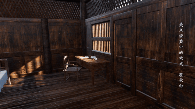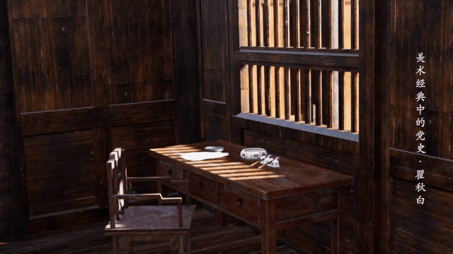 囚室里陈设简陋,桌子上放着纸笔墨砚,对面是一张简陋的木床。在这间十平方米左右的狭小囚室里,瞿秋白度过了他生命的最后40天。