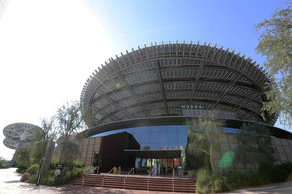 从世博园的东南大门进入,游客第一眼见到的便是一片“钢铁森林”。18座被称作“能源树”的太阳能发电设施错落有致地排列开来。矗立在“能源树”之后的是可持续性展馆,该馆又名“大地”,其外形的灵感来源于阿联酋的国树牧豆树,这是一种生长在沙漠的耐旱树种。树木生长于大地,又保护着大地,其象征意义为整个建筑带来优美而又富于哲理的诗意。