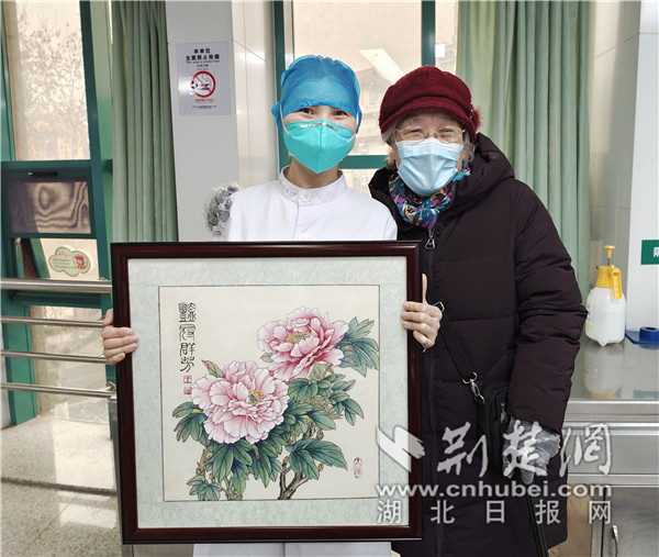 春节临近,王奶奶决定将这幅画作为新年礼物送给医生。近日,王奶奶拄着拐杖,在儿子的陪同下专程来到武汉市中心医院口腔科,将亲自创作的牡丹图送给了王艳医生。收到患者如此真诚、用心的礼物,王艳既惊喜又特别感动,她表示,“这是对我们工作的最大认可和鼓励,也是我们继续前进的动力。”