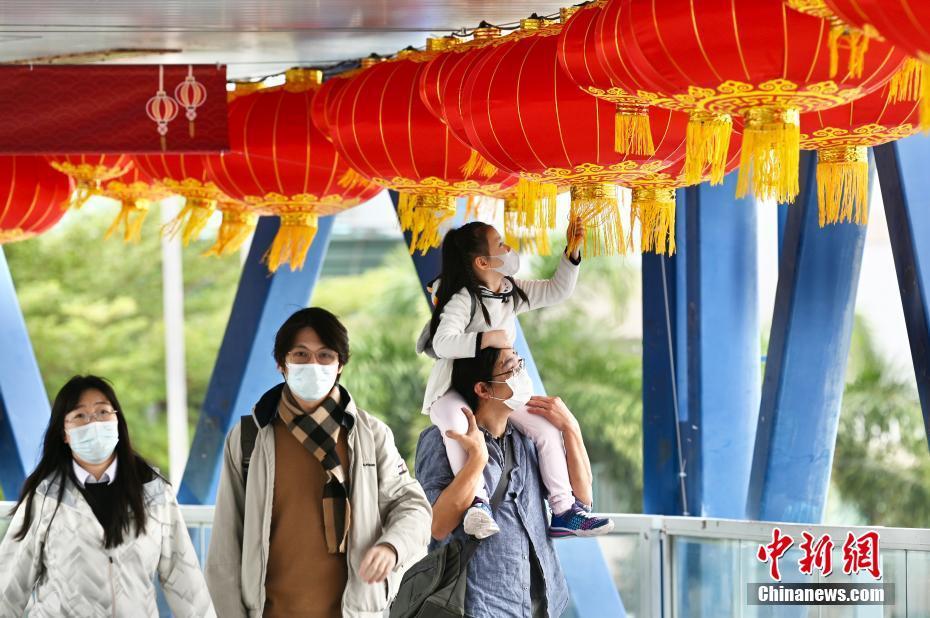 春节将近,香港新春气氛渐浓。1月18日,香港中环国际金融中心二期外的连接中环码头的天桥上挂满大红灯笼,迎接虎年新春。图为大红灯笼吸引儿童触摸。中新社记者 李志华 摄