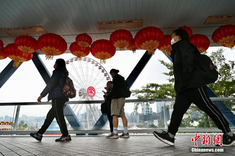 春节将近,香港新春气氛渐浓。1月18日,香港中环国际金融中心二期外的连接中环码头的天桥上挂满大红灯笼,迎接虎年新春。图为大红灯笼与摩天轮。中新社记者 李志华 摄