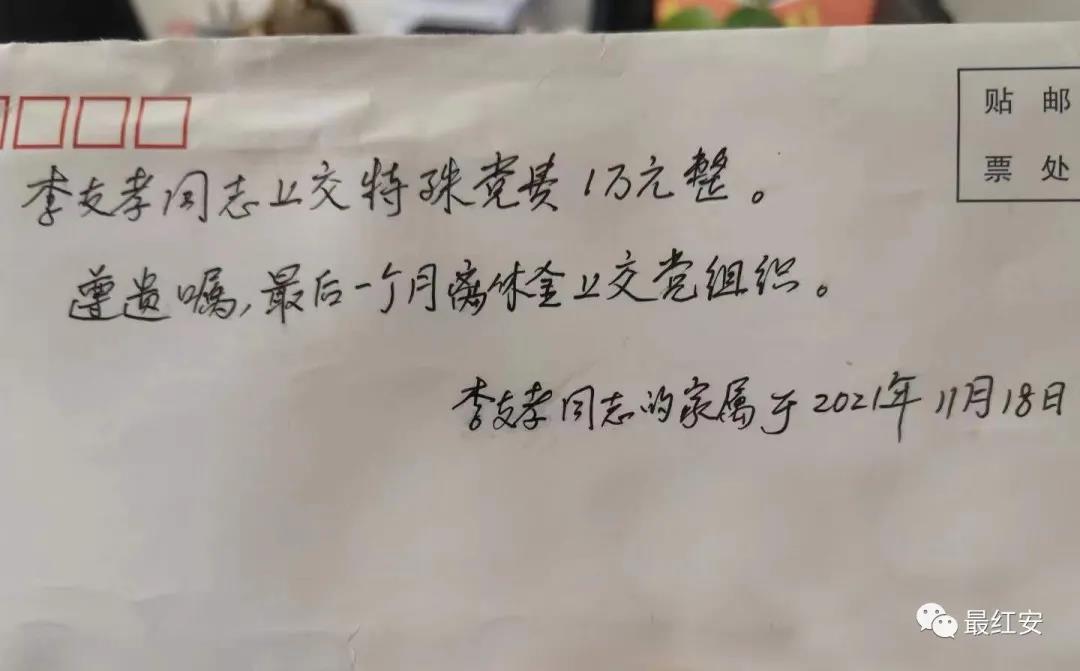 李红山说:“我们姐弟4人,还有所有的晚辈们,谁入党了,第一个月的党费都由父亲来交,他总是最高兴的那一个!所以我们一定要按照父亲的遗嘱去办理(缴纳特殊党费),一方面是完成他的遗愿,另一方面也是好的家风传承。”