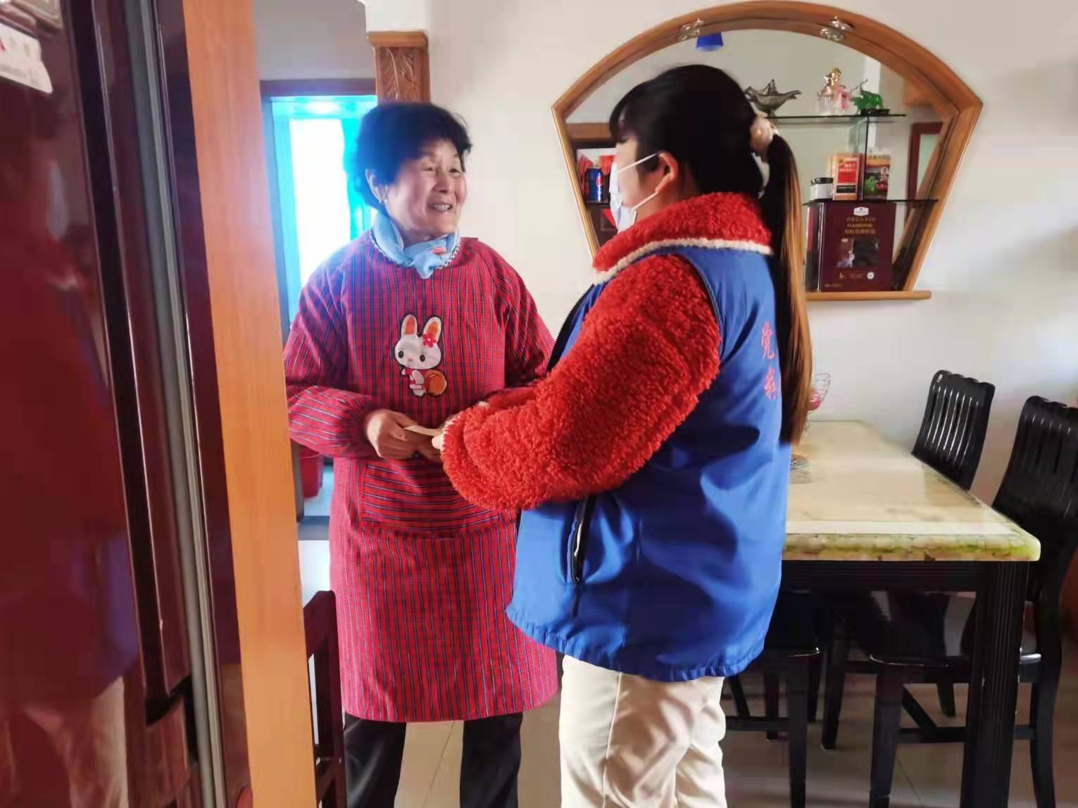 1月18日,洲头社区巾帼志愿者服务队工作人员为吴美丽(左)送来温暖物资。 通讯员高璇 摄