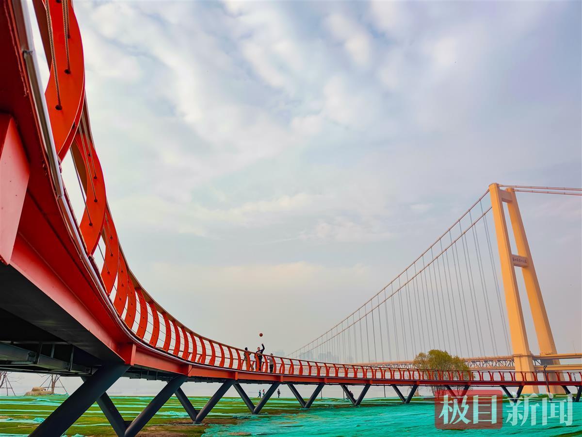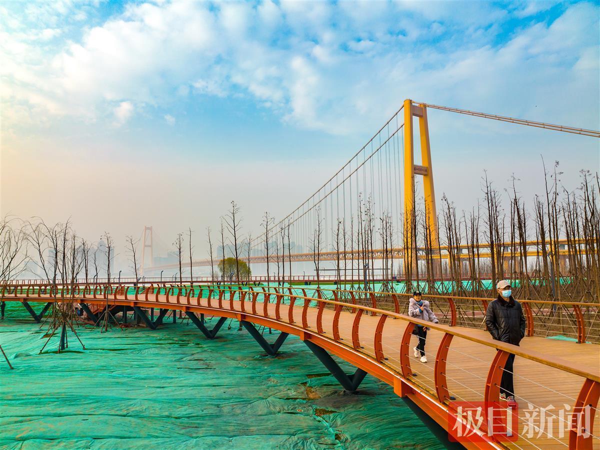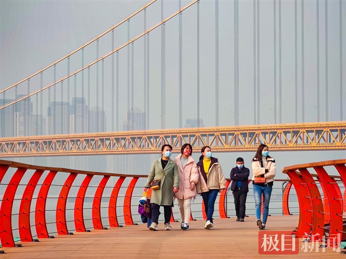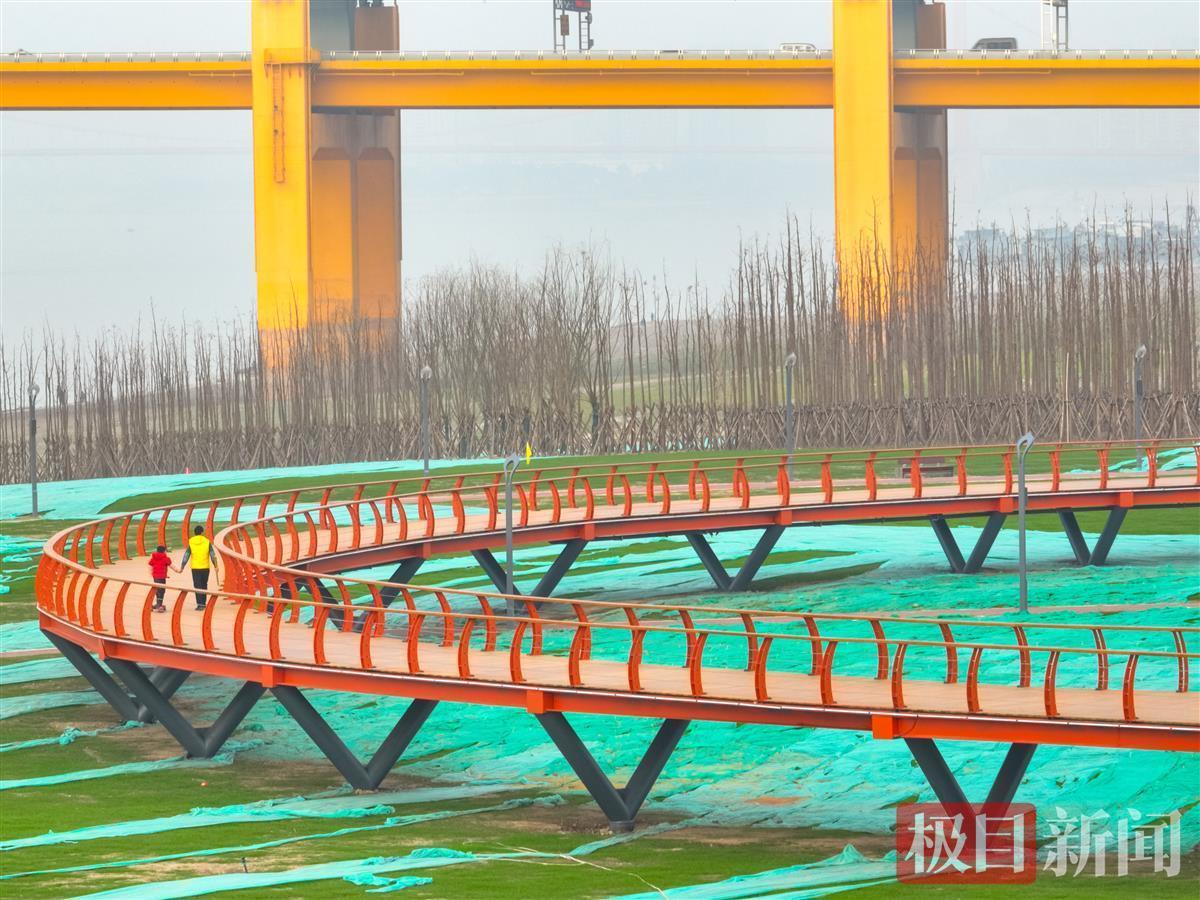 1月19日,在武汉市洪山江滩杨泗港大桥南岸,一条橘红色观江栈道蜿蜒如带,吸引不少市民游客来此打卡。空中俯瞰,这条长近500米的栈道呈S形。