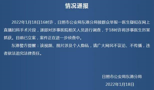 山东省日照市公安局东港分局18日通报称,接到群众举报后,立即对涉事医院相关人员进行调查,已将涉事医生厉某抓获。